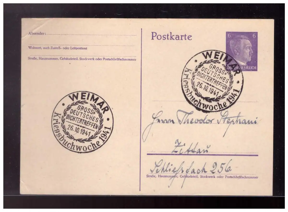 Dt- Reich (023081) Ganzsache P299 gestempelt mit SST Weimar Gross-Deutsches Dichtertreffen am 26.10.1941 Kriegsbuchwoche