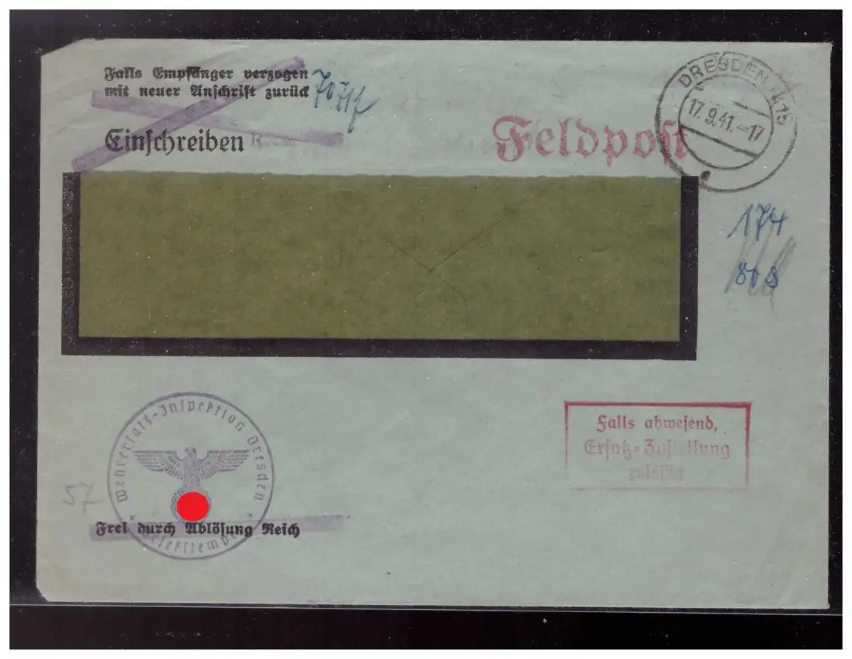 Dt.- Reich (023195) Vorgedruckter Fensterbrief mit diversen S´tempeln gelaufen Dresden 17.9.1941
