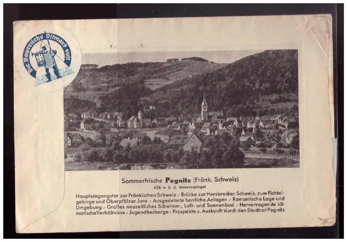 Dt- Reich (023271) Vorgedruckter Umschlag Stadtrad Pegnitz, RS Bild Pegnitz mit Vignette Die Bayrische Ostmark ruft, gel