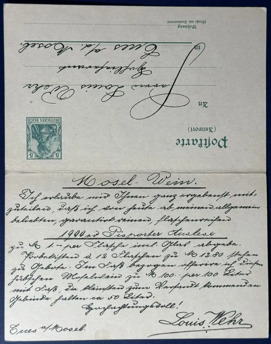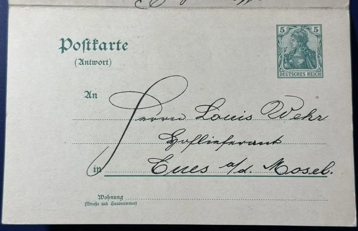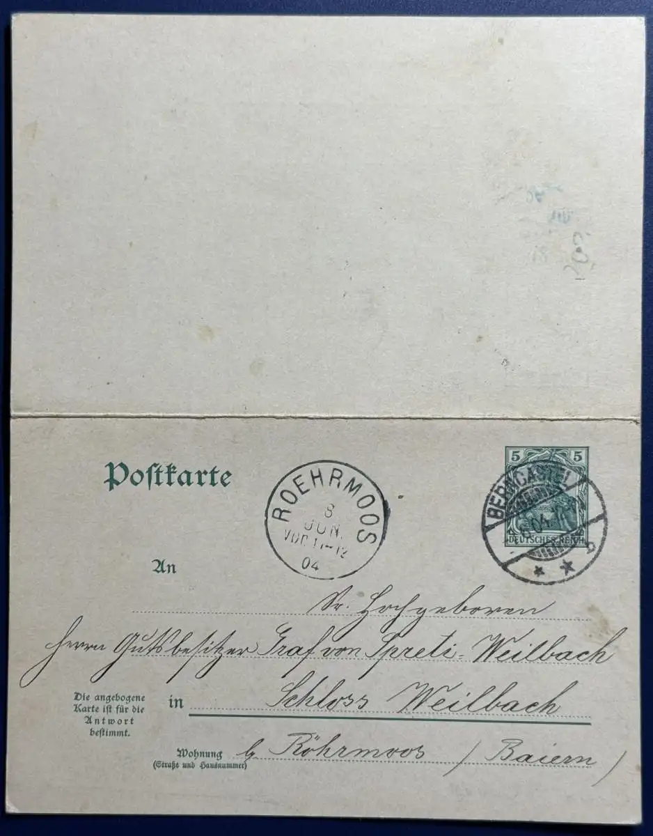 Ganzsache, Antwortpostkarte, 1904, Mi.Nr. P67, gelaufen mit Poststempel vom 07.06.1904 von Bernkastel nach Röhrmoos, Schloß Weilbach. Frageteil gestempelt, Antwortteil vorbereitet, gute Erhaltung (siehe Scan), gut lesbare Stempel.