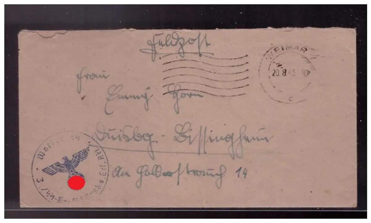 DT-Reich (023475) Feldpost Waffen SS gelaufen Weimar 20.8.1943, Wachmannschaft KZ "3 SS K.AK