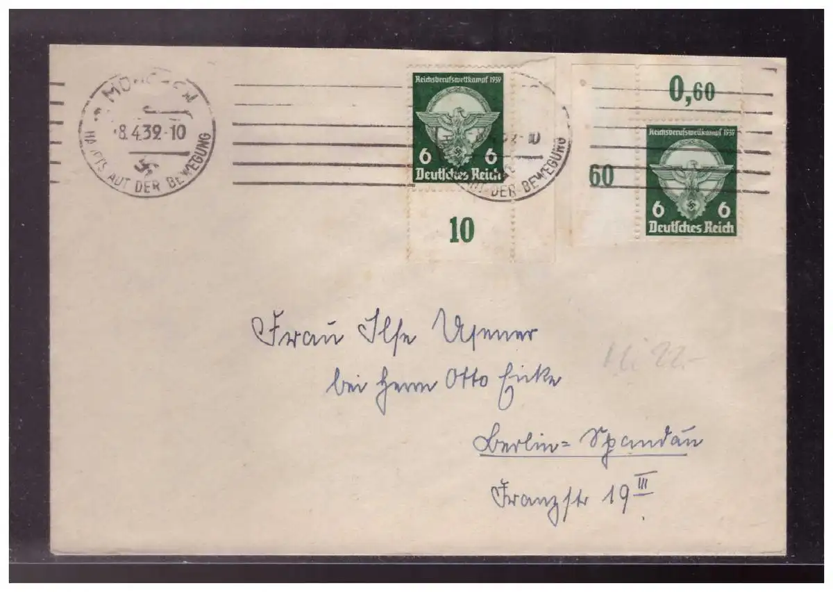 DT- Reich (024190) Brief MEF, ER OL und UR der MNR 689, gelaufen München 8.4.1939