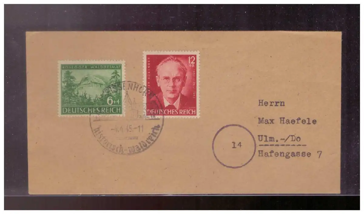 Dt- Reich (024559) Propaganda Brief mit Sonderstempel Weissenhorn historisch- Waldreich, vom 4.4.1945!! spätes Datum