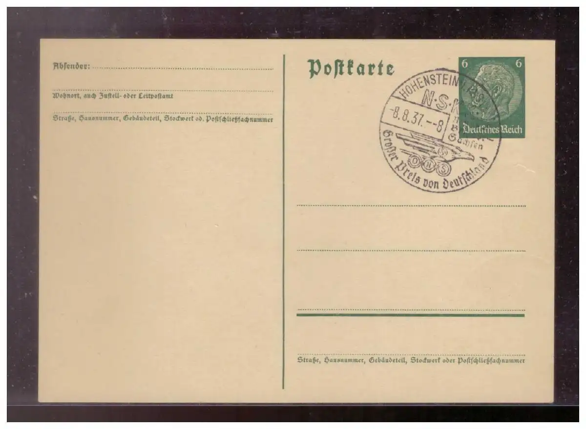 Dt- Reich (024565) Propaganda Ganzsache mit SST Großer Preis von Deutschland, NSKK Hohenstein, Sachsen vom 8.8.1937