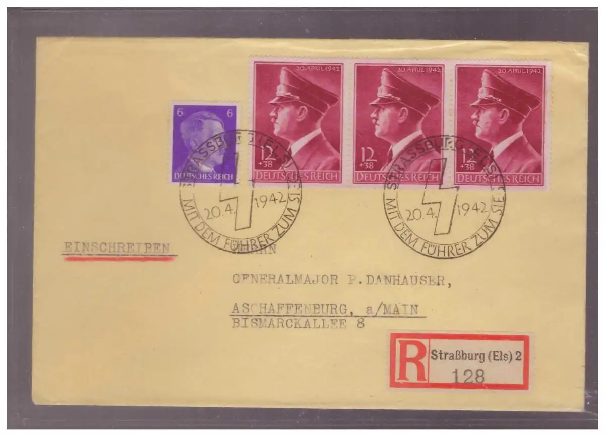 Dt- Reich (024636) Einschreiben Brief an Generalmajor F.Dannhauser gel. von Strassburg nach Aschaffenburg mit SST 20.4.