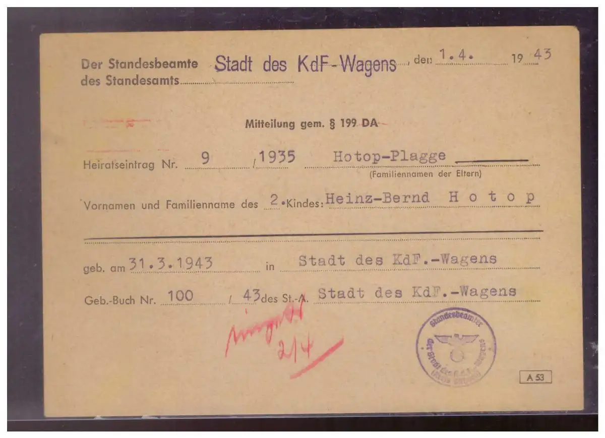 Dt- Reich (024813) Propaganda Freistempel, Bürgermeister der Stadt des KDF- Wagens bei Fallesleben, gest. am 1.4.1943