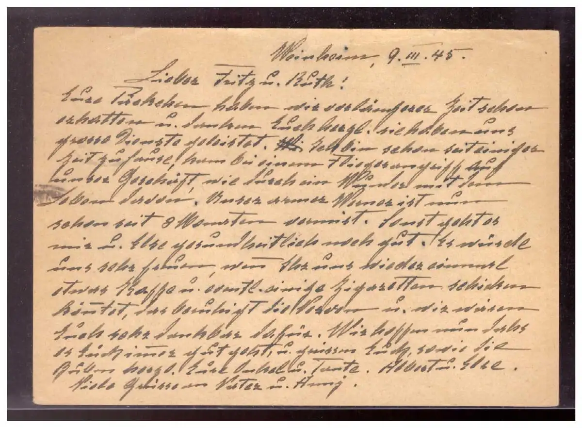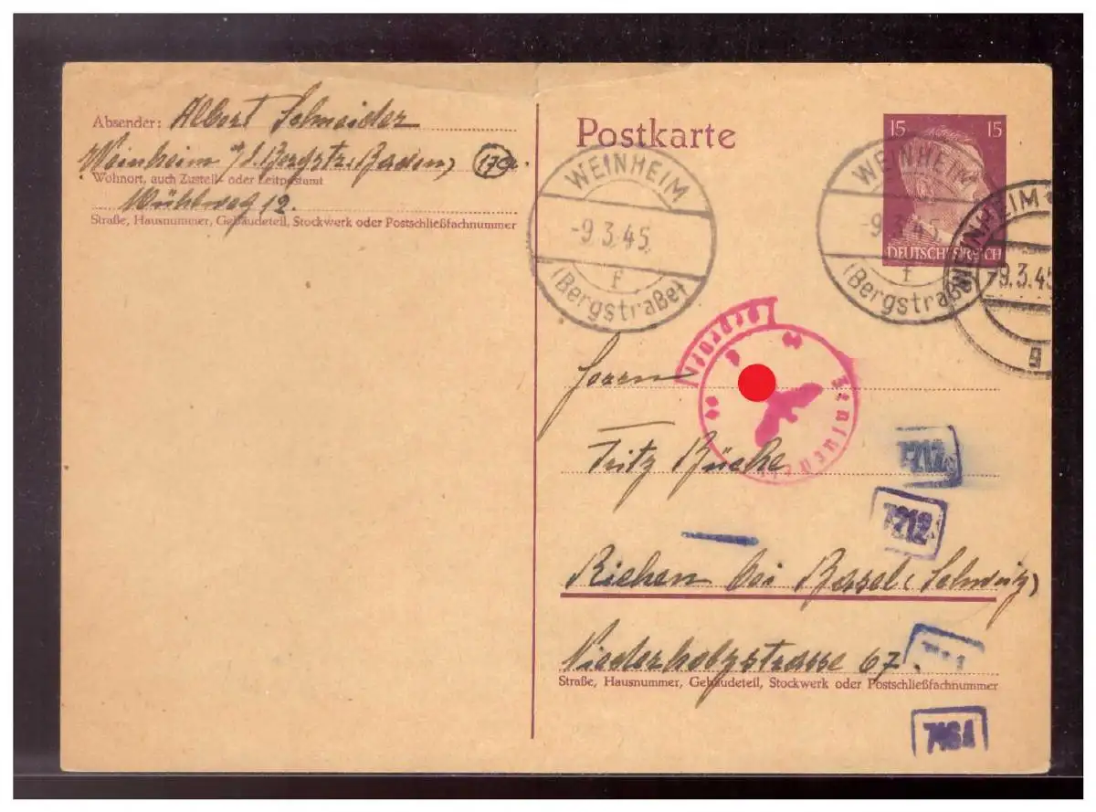 Dt- Reich (020238) Ganzsache P300 Auslandskarte gelaufen Weinheim/ Schweiz sehr spät 9.3.45 mit OKW- Zensur