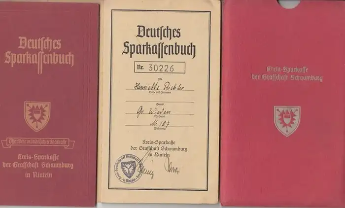 Deutsches Sparkassenbuch. - Kreissparkasse der Grafschaft Schaumburg in Rinteln. - Henriette und Irene Richter, Konvolut mit 2 Teilen: Deutsches Sparkassenbuch Nr. 30226 für Henriette Richter, Gr. Wieden, Nr. 107 / Nr. 30450 für Irene Richter, ebenfalls w