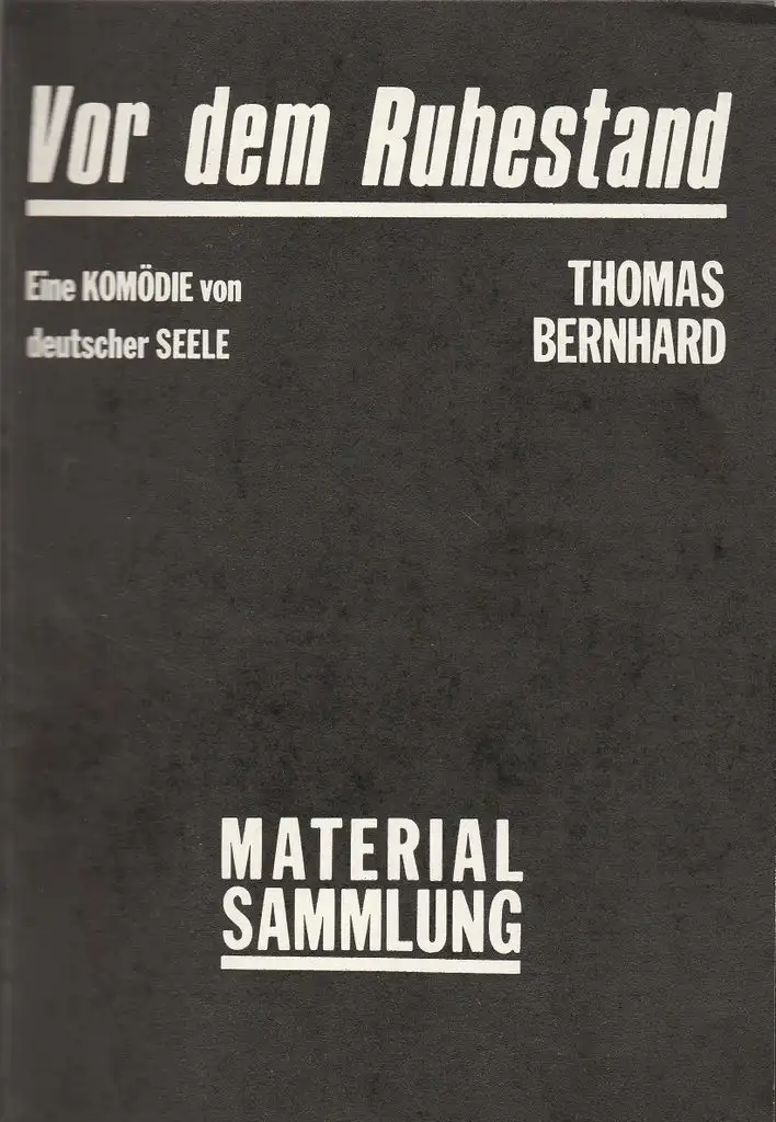 Materialien zud Inszenierung von Thomas Bernhards Vor dem Ruhestand im Deutschen Theater Berlin. Beilagen: Heinrich Mann: Der Haß ( 4 Seiten ), Deutsche Volkszeitung Frankfurt am Main 8. November 1985 ( 3 Seiten ), Thomas Bernhard: Meine Heimatstadt ( 6 Seiten ), Lionel Richard: Adler und Eiche ( 10 Seiten ), Gerd Fuchs: Adenauers Enkel ( 8 Seiten ). Eine Komödie aus deutscher Seele. Regie: Michael Jurgons, Friedo Solter. Bühne: Hans-Jürgen Nikulka. Kostüme: Christine Stromberg. Mitwirkende: Klaus Piontek, Christine Schorn, Inge Keller - Theaterprogramm, Opernprogramm, Ballettprogramm, Musicalprogramm, Konzertprogramm, Theatermemorabilia, Programmhefte Sammlung, deutsche Theatergeschichte.