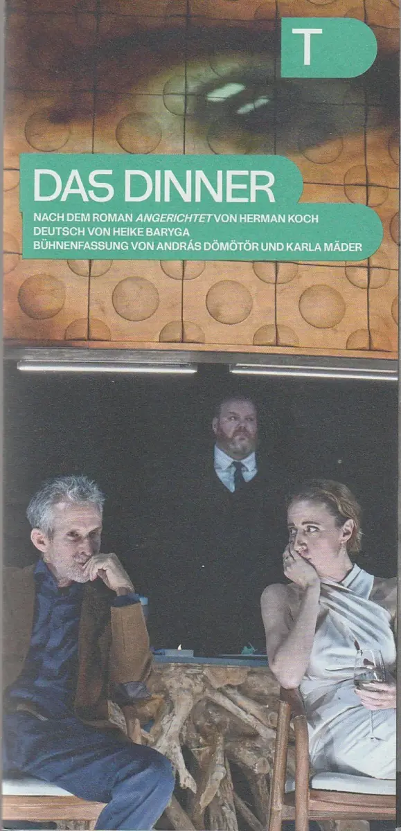 Nach dem Roman ANGERICHTET von Herman Koch. Deutsch von Heike Baryga. Bühnenfassung von Andras Dömötör und Karla Mäder. Regie: Andras Dömötör. Bühne: Ann-Christine Müller. Kostüme: Almut Eppinger. Musik: Tamas Matko. Mitwirkende: Ulrich Matthes, Maren Eggert, Bernd Moss, Wiebke Mollenhauer, Jens Koch, Andri Schenardi, Carlo Krammling - Programmhefte24 - Programmhefte für Theater, Oper & Ballett.