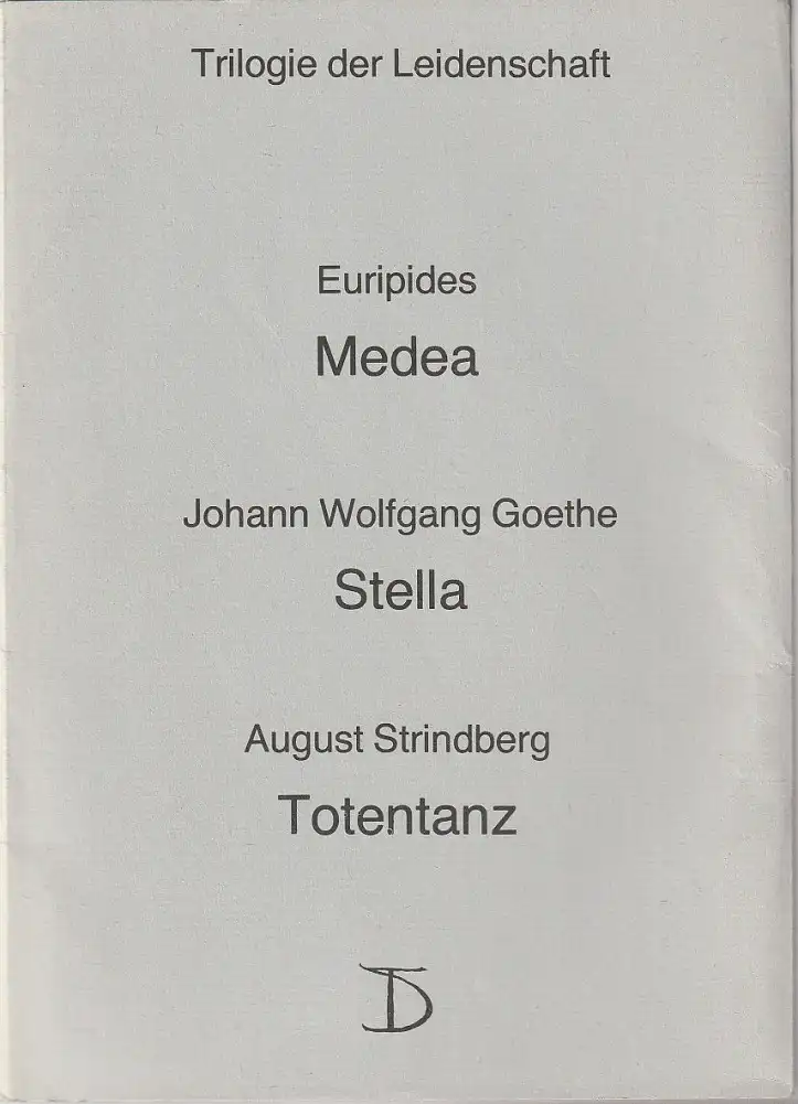 Euripides MEDEA Premiere 11. Januar 1986. Regie: Alexander Lang. Bühne und Kostüme: Volker Pfüller. Mitwirkende: Katja Paryla, Christian Grashof, Dieter Montag, Michael Gwisdek, Maximilian Löser, Katrin Klein / Johann Wolfgang Goethe STELLA Premiere 11. Januar 1986. Regie: Alexander Lang. Bühne und Kostüme: Volker Pfüller. Mitwirkende: Margit Bendokat, Gudrun Ritter, Roman Kaminski, Johanna Schall, Katrin Klein, Maximilian Löser / August Strindberg TOTENTANZ Erster und zweiter Teil. Premiere 17. Mai 1986. Regie: Alexander Lang. Bühne und Kostüme: Volker Pfüller. Mitwirkende: Christian Grashof, Katja Paryla, Dieter Montag, Frank Lienert, Katrin Klein, Maximilian Löser - Theaterprogramm, Opernprogramm, Ballettprogramm, Musicalprogramm, Konzertprogramm, Theatermemorabilia, Programmhefte Sammlung, deutsche Theatergeschichte.