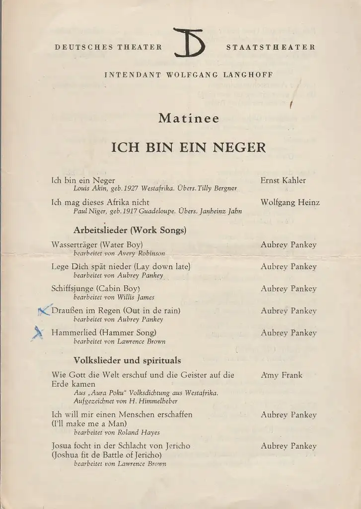 Deutsches Theater Staatstheater, Wolfgang Langhoff: Programmheft MATINEE ICH BIN EIN NEGER 1957.
