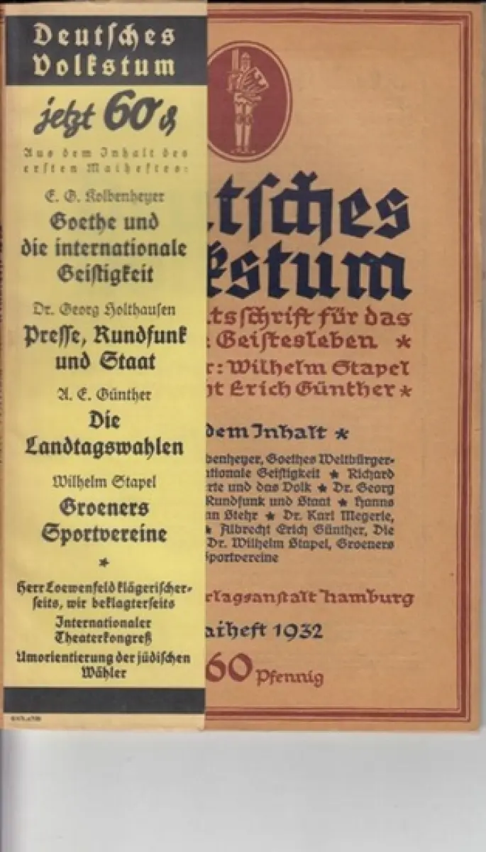 Titel: Deutsches Volkstum, 14. Jahrgang, 1. Maiheft 1932, Monatsschrift für das deutsche Geistesleben. Aus dem Inhalt: Dr. Dr. F. B. Kolbenheyer - Goethes Weltbürgertum und die internationale Geistigkeit / Dr. Wilhelm Stapel - Kolbenheyers Lehre vom Logochonismus / Dr. Georg Holthausen - Presse, Rundfunk und Staat / Dr. Paul Ferdinand Schmidt - Runge und die Romantiker / u.a