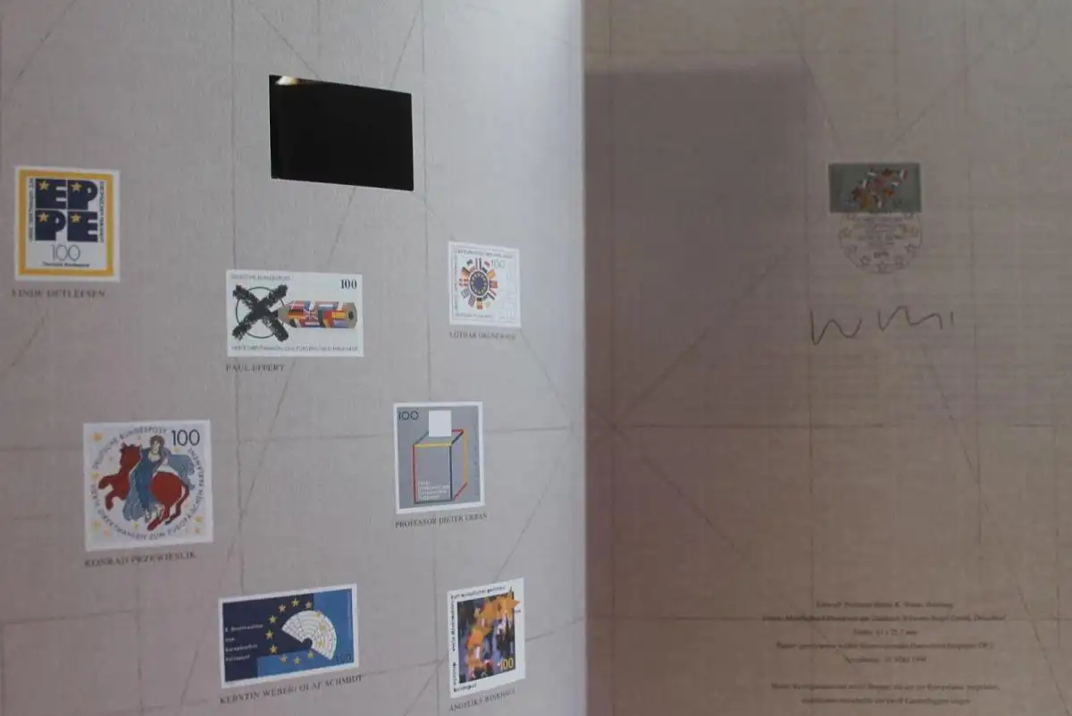 Aufwändig gestalter und hergestellter Bogen aus Kunstdruckkarton mit Leinenstruktur im Format etwas größer als DIN A4. Auf dem Doppelbogen Marke oder Block mit Ersttagsstempel, sowie die nicht angenommenen Konkurenzentwürfe. Unter der Marke befindet sich die Unterschrift (Faksimile) der Entwerfes. Diese Blätter wurden jewils nur in einer sehr kleinen Auflage von der Deutsche Post an Abonnenten abgegeben und sind somit viel seltener als ähnliche Produkte, wie die Ersttags-Sammelblätter oder privat hergestellten Künstler-Ersttagsblätter. Auf Seite 4 bzw. 6 (nicht abgebildet) eine ausführliche Beschreibung zum Anlaß.
