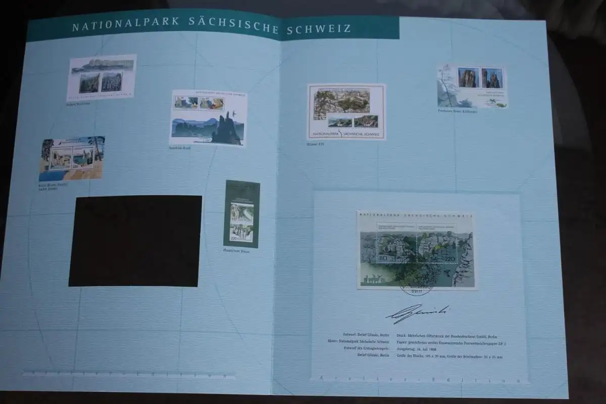 Aufwändig gestalter und hergestellter Bogen aus Kunstdruckkarton im Format etwas größer als DIN A4. Auf dem Doppelbogen Marke oder Block mit Ersttagsstempel, sowie die nicht angenommenen Konkurenzentwürfe. Diese Blätter wurden jewils nur in einer sehr kleinen Auflage von der Deutsche Post an Abonnenten abgegeben und sind somit viel seltener als ähnliche Produkte, wie die Ersttags-Sammelblätter oder privat hergestellten Künstler-Ersttagsblätter. Auf Seite 4 (nicht abgebildet) eine ausführliche Beschreibung zum Anlaß.