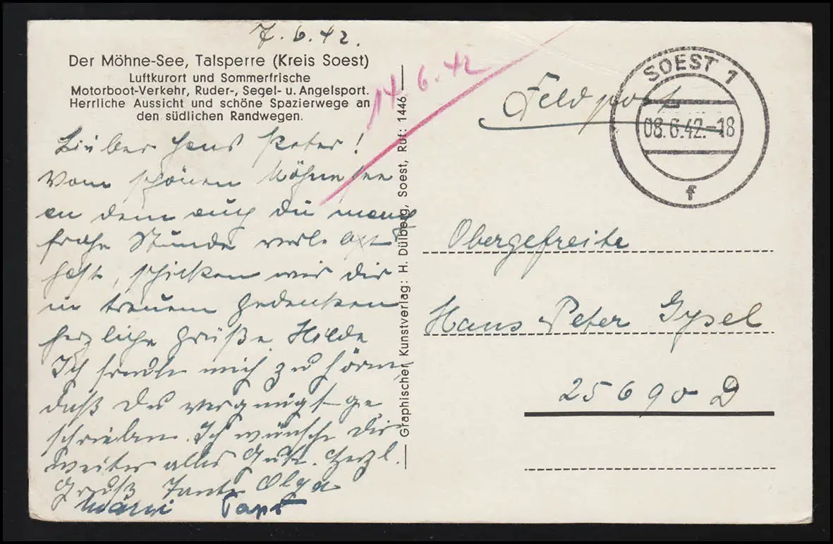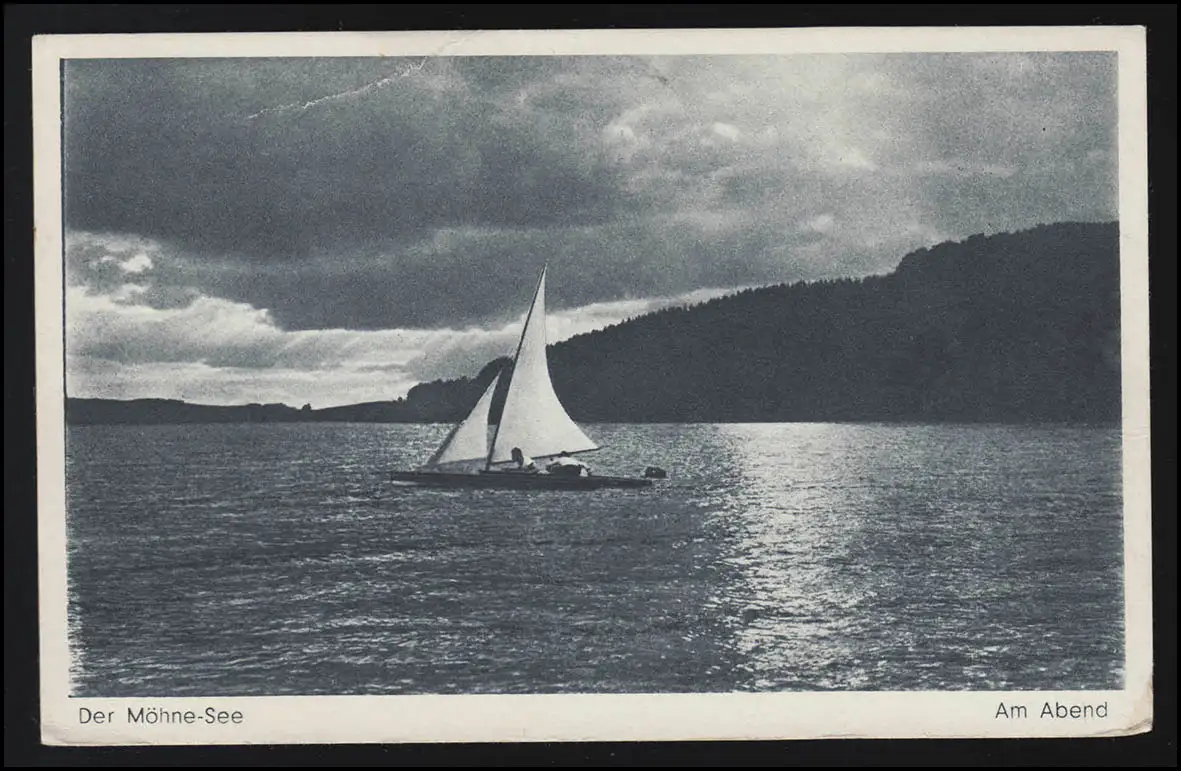 Deutschland Möhne See Talsperre mit Seegelboot am Abend, Feldpost SOEST 8.6.42