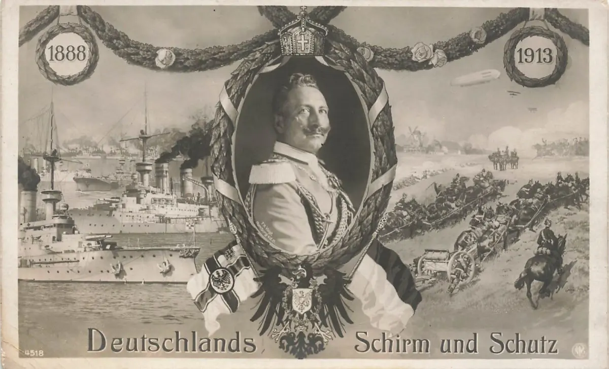 Deutschlands Schirm und Schutz, Wilhelm II. mit Dampfer Patriotika Postkarte AK
