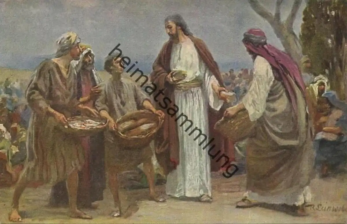 Die Heilige Schrift - Die Speisung der 5000 Mann - Künstler-Ansichtskarte Rob. Leinweber ca. 1910