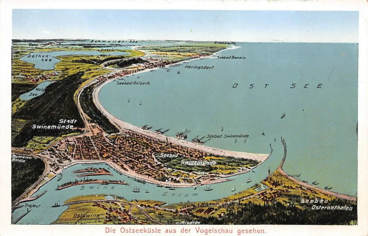 Die Ostseeküste aus der Vogelschau gesehen Stadt Swinemünde Postkarte AK