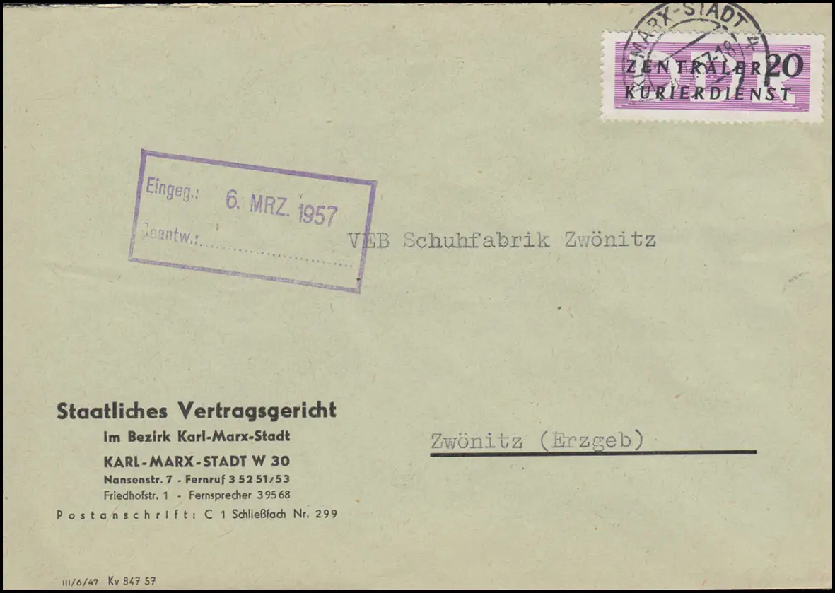 Dienst B ZKD 7 XII Brief Staatliches Vertragsgericht KARL-MARX-STADT 4.3.1957