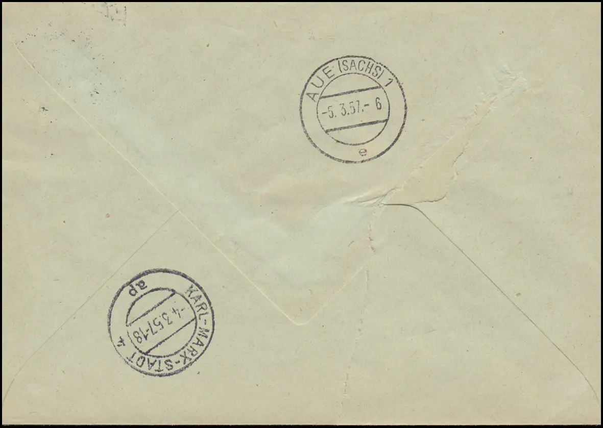 an die Schuhfabrik in Zwönitz über AUE (SACHS) 1 - 5.3.57, Eingangsstempel 6.3.1957