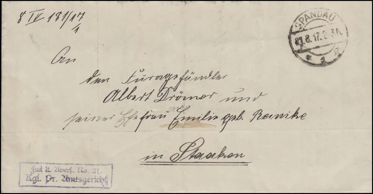 vom Königliche-Preußischem Amtsgericht zwecks "Hinterlassungsschein über eine Verfügung von Todes wegen"