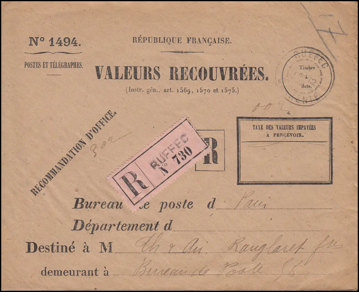 Dienstbrief VALEURS RECOUVREES als R-Brief Not-R-Zettel RUFFEC 14.12.17
