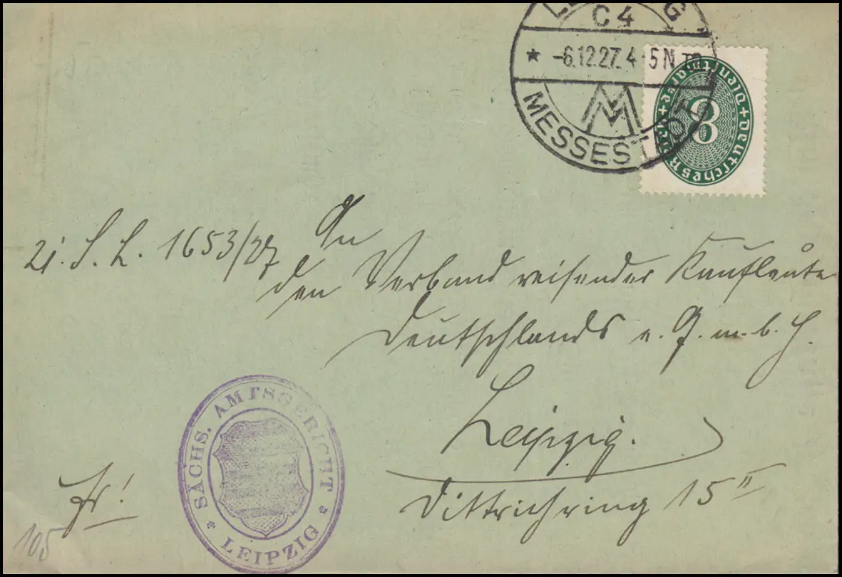 Dienstmarken 116 Ziffer 8 Pf EF Ortsbrief Amtsgericht LEIPZIG MESSESTADT 6.12.27