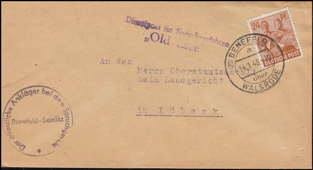 Dienstpost Spruchverfahren Old Lace vom Ankläger Brief BENEFELD-WALSRODE 14.1.48