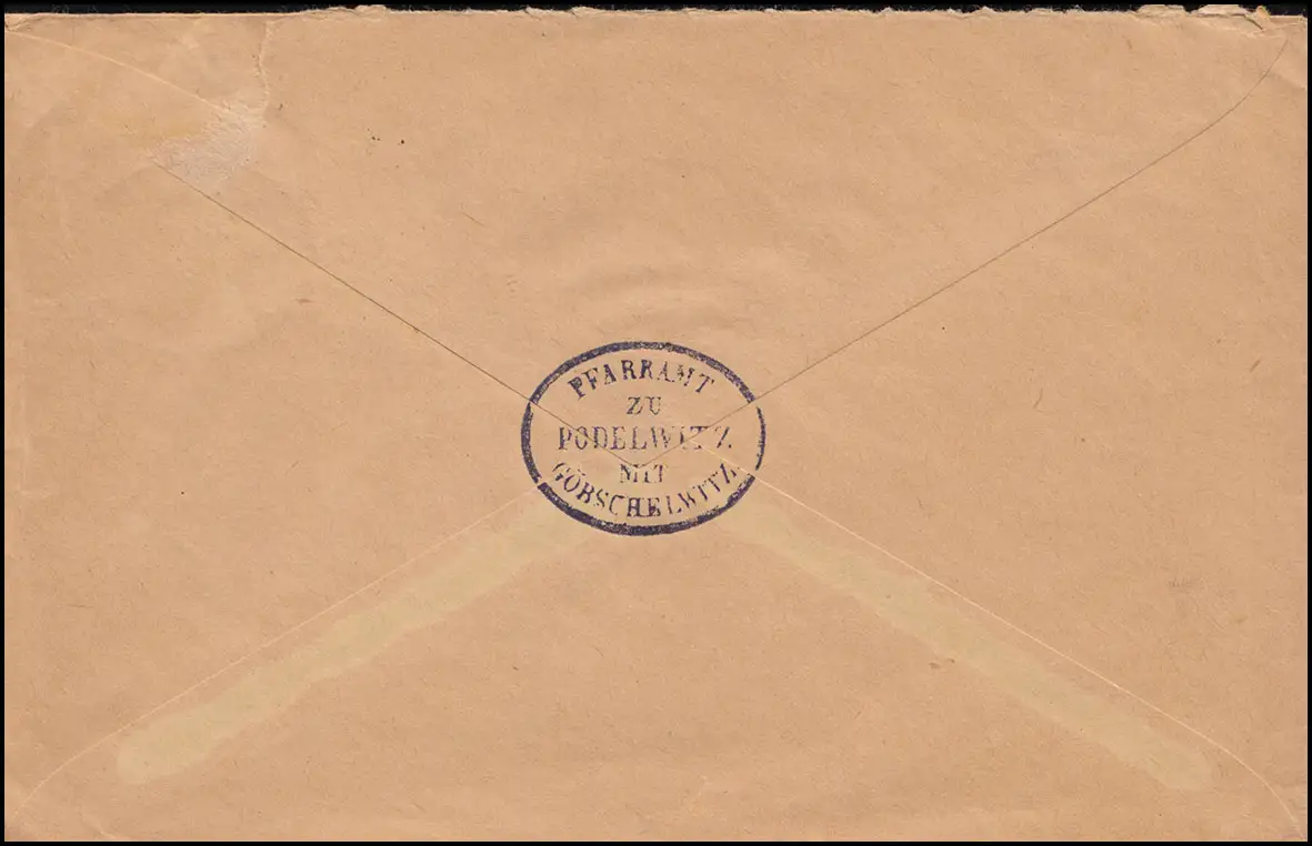 Portopflichtige Dienstsache mit Nachporto nach Hannover. Mit Briefstempel "Pfarramt zu Podelwitz mit Göbschelwitz" und Tagsesstempel "WIEDERITZSCH (AMTSH. LEIPZIG) a 22.6.34