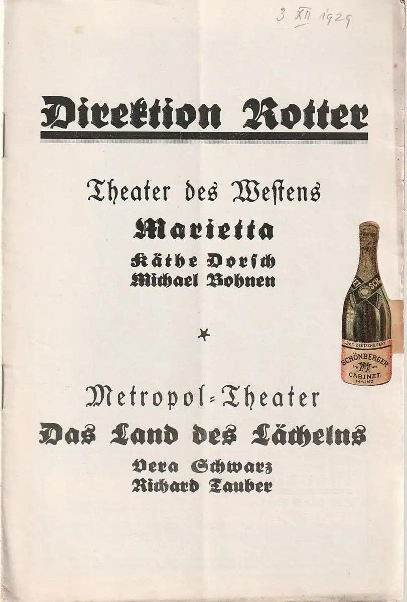 Direktion Rotter, Theater des Westens: Programmheft Oscar Straus MARIETTA 3. Dezember 1929.