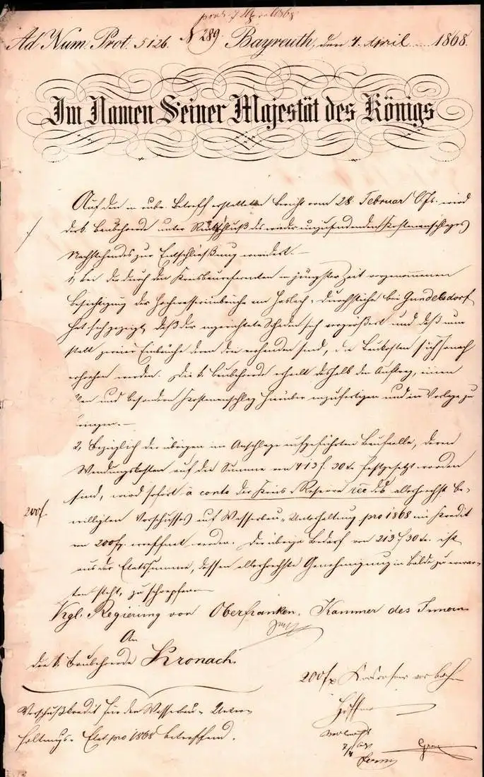 Dokument Adel , Kronach in Oberfranken 1868 , Bayreuth !!!