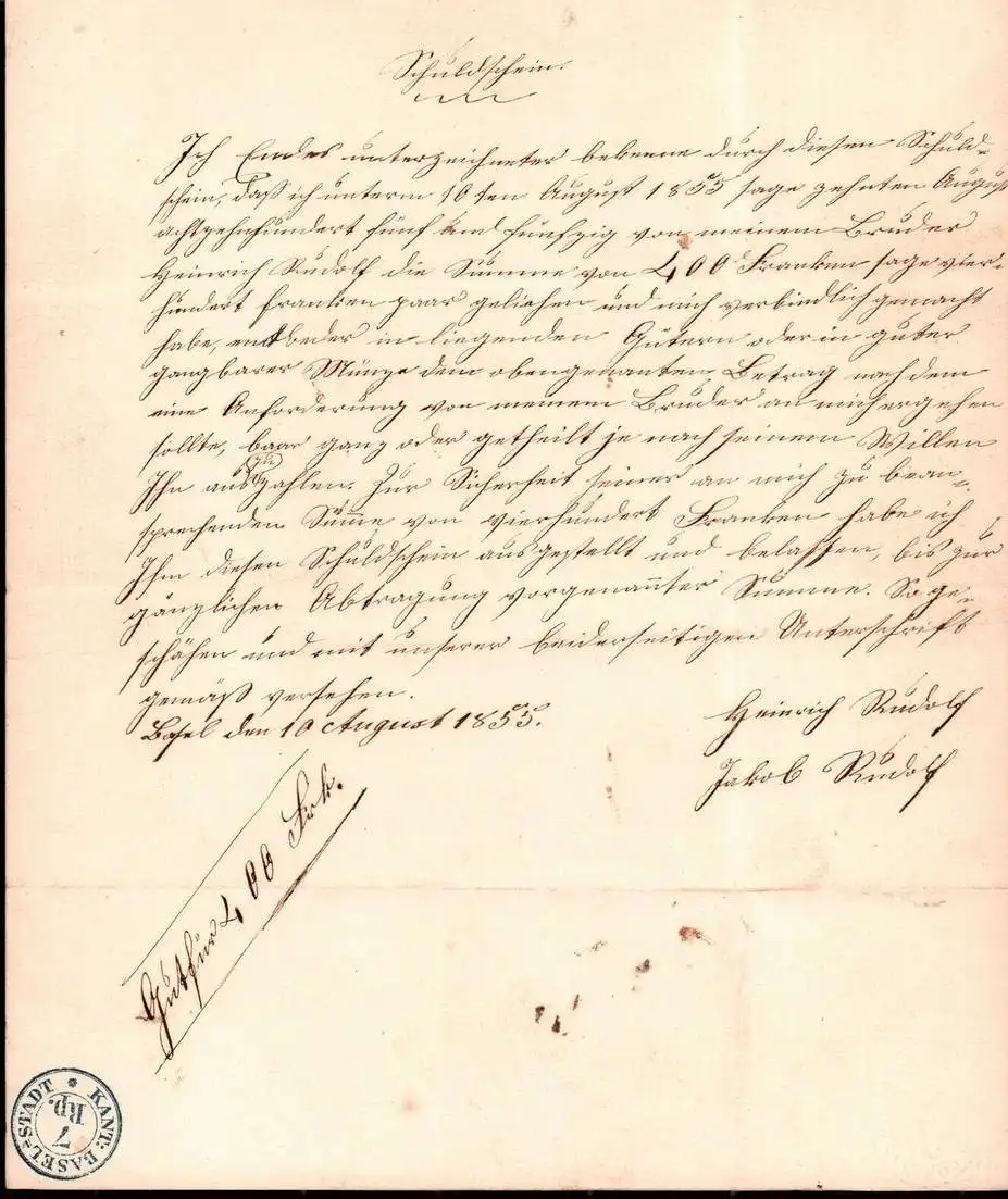 Dokument Adel , Lotal / Lofal 1855 , Basel , Jakob Rudolf !!!