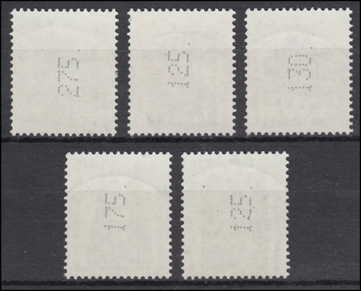 Fünf Wertstufen Doppelnominale mit WENIG Melierfasern im Papier (statt viele), Nachauflage aus Rollen, 100/110/300/440/720 Pf - alle Marken mit rückseitiger Zählnummer und zeitgerechtem Vollstempel. Im MICHEL-Spezialkatalog bei der jeweiligen Markenausgabe unter y katalogisiert.