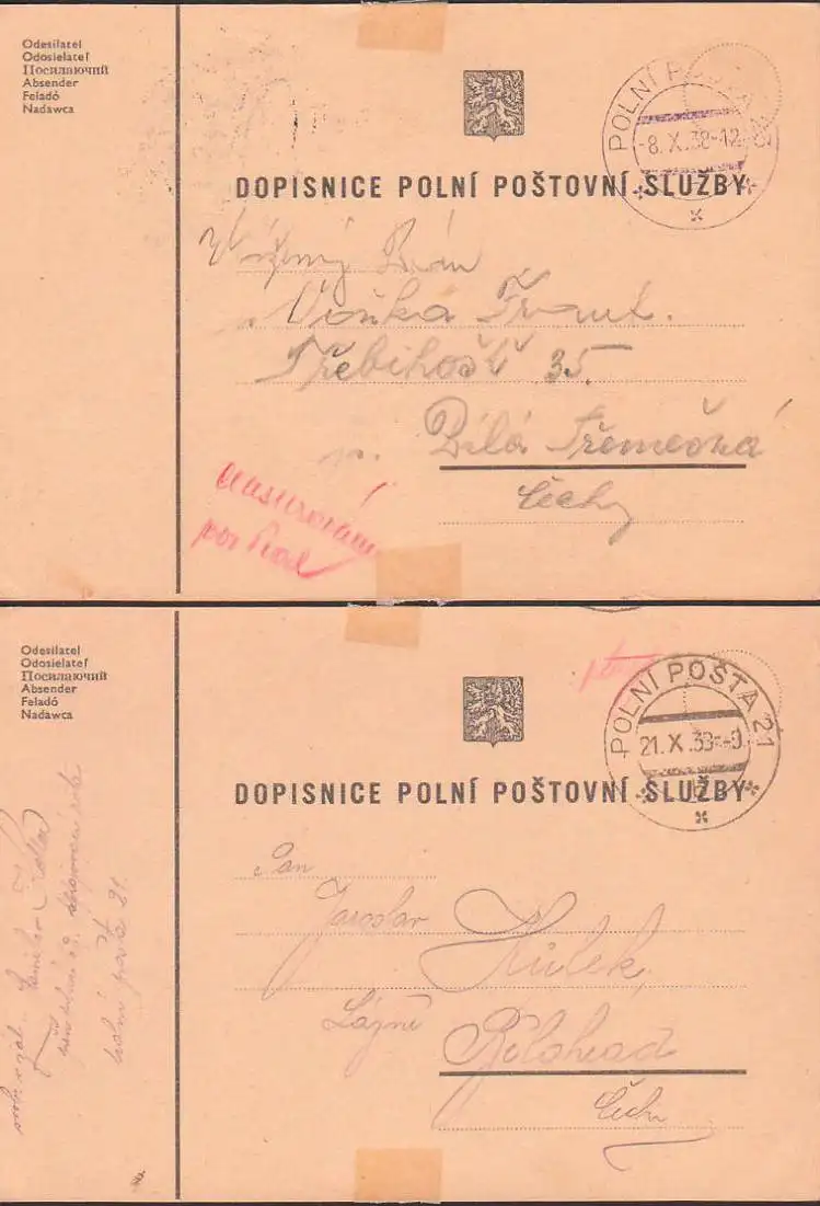 Dospinice polni postovni sluzby, zwei Feldpostkarten 1938