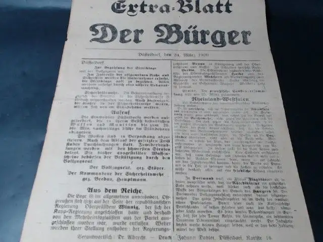 Der Bürger. Extra-Blatt. 24. März 1920. Verantwortlich: Dr. Albrecht. [Flugblatt zur Lage des Kapp-Putsches] Aus dem Inhalt: Im Interesse der allgemeinen Ruhe und Sicherheit werden die Unternehmer ersucht, die Streiktage voll zu bezahlen. Die Einwohner Düsseldorfs werden aufgefordert, die in ihrem Besitz befindlichen Waffen abzugeben... Der Vollzugsrat. Gez. Stöver, Der Kommandeur der Sicherheitswehr gez. Bredan, Hauptmann. Aus dem Reiche. Rheinland-Westphalen. Dortmund. Papier dem Alter entsprechend gebräunt und an den Rändern leicht knickspurig, teils leicht eingerisssen. Sonst guter Gesamtzustand