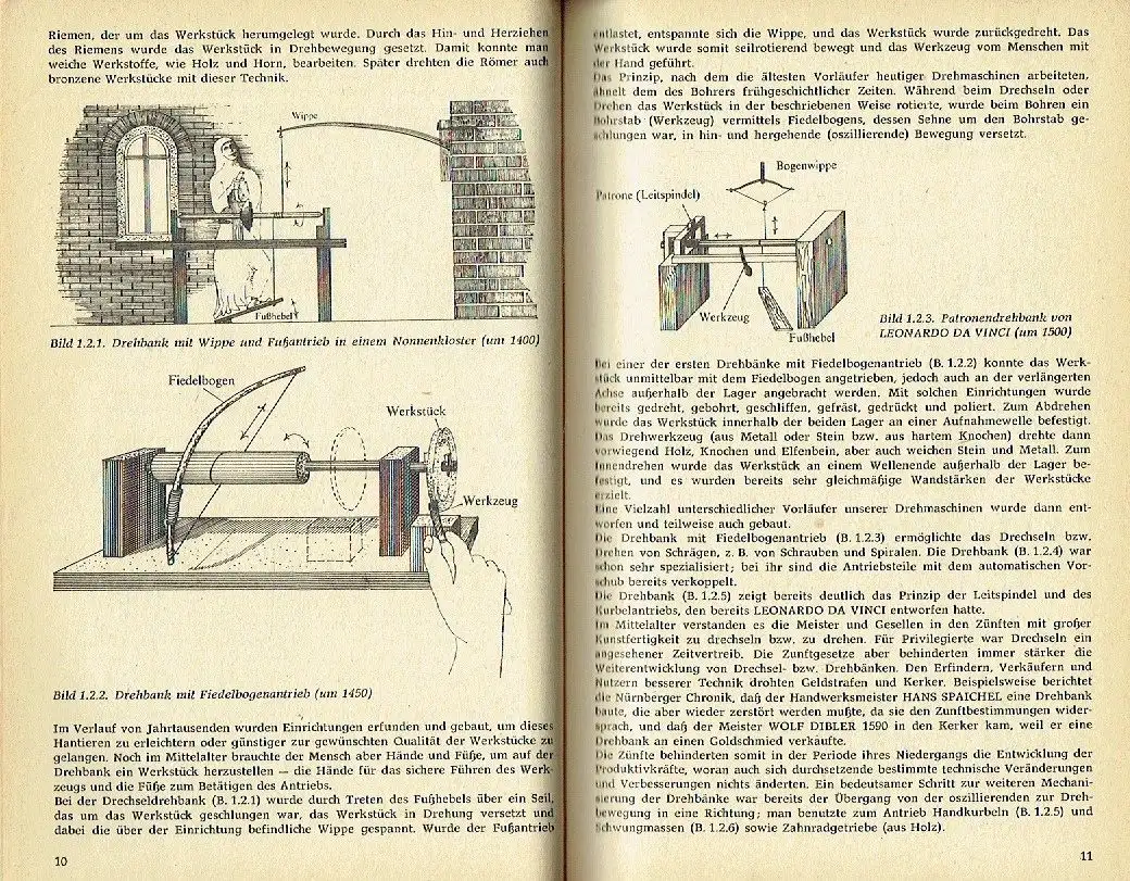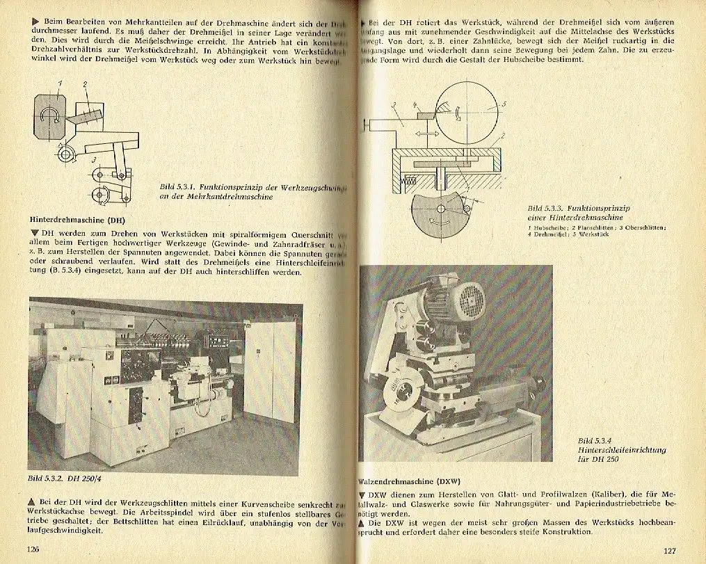 sehr guter Zustand, geringe Gebrauchs- und Alterungsspuren: Papier etwas vergilbt, aber Seiten sauber und ordentlich, Drehen ist das verbreitetste spanende Fertigungsverfahren der Metallbearbeitung und in seinen Grundzügen bereits aus dem polytechnischen Unterricht der Oberschule bekannt. Die Arbeit mit dem Lehrbuch DREHEN setzt daher einige Kenntnisse über Drehen voraus bzw. dient in einigen besonders kurzgefaßten Abschnitten nebst Aufgaben zum Wiederholen. Das Lehrbuch informiert dann aber weiterführend über den Spanungsvorgang und die Spannmittel, über Werkzeuge und Maschinen in der modernen Produktion. Weiterhin können die Fertigungsmöglichkeiten auf Drehmaschinen erkannt werden, und viele Hinweise für die praktische Ausbildung werden gegeben. Im Mittelpunkt stehen dabei die Leit- und Zugspindeldrehmaschine und die auf dieser Maschine ausführbaren Arbeiten. Die Leit- und Zugspindeldrehmaschine ist die in der Lehrwerkstatt und Produktion dominierende Drehmaschine; an ihr sind die für Drehmaschinen charakteristischen Merkmale auch am einfachsten zu erkennen. nicht nur für das Drehen, sondern auch für das Fräsen, Bohren, Schleifen, Hobeln und Stoßen zutreffenden Bedingungen und Erfordernisse sind in anderer berufsbildender Literatur (siehe Seite 4) beschrieben. Gemeinsam mit einem Teil dieser Literatur soll das Lehrbuch DREHEN den Erwerb und das Festigen der erforderlichen berufstheoretischen und -praktischen Kenntnisse, Fähigkeiten und Fertigkeiten erleichtern. Das Lehrbuch kann auch einen Beitrag zur fachlichen Weiterbildung leisten; wenn die berufliche Ausbildung des Lernenden bereits mehrere Jahre zurückliegen sollte, kartoniert, ca. 14,5 x 21,5, 200 Seiten mit 297 Bildern und 22 Tafeln
