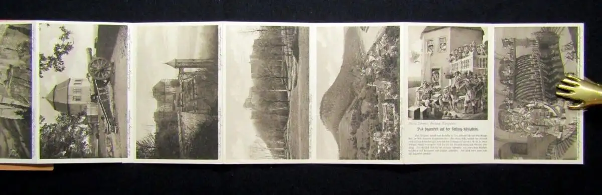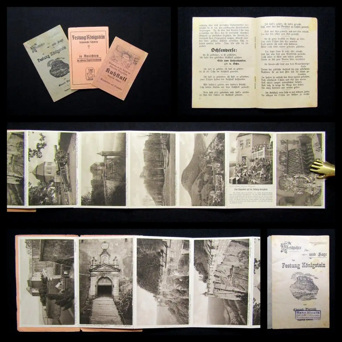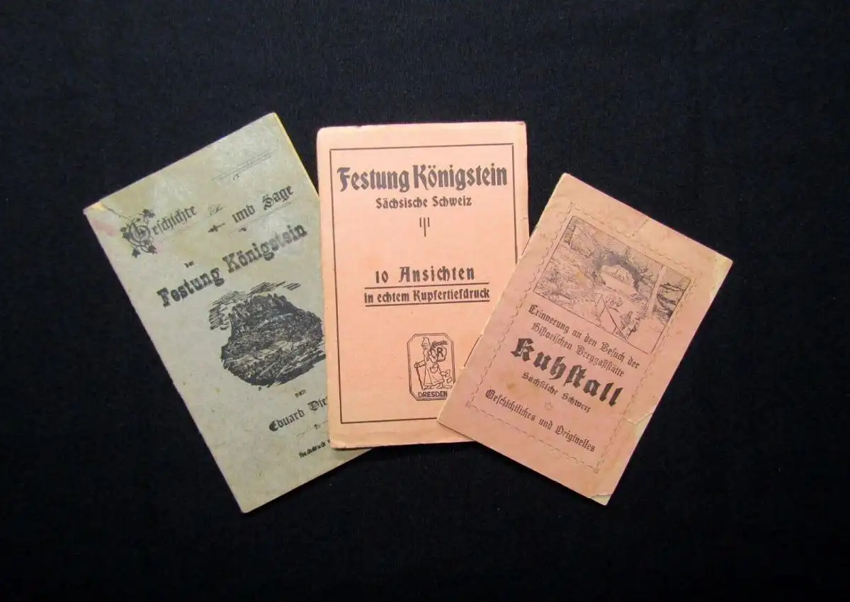 Festung Königstein(10 Ansichten): Falz am Rücken gerissen, Leporello in Ordnung. Königstein(Geschichte und Sage): Einband fleckig und eingerissen. Titel mit Stempel Heft lose innenliegend. Kuhstall: Vorderer Deckel mit seitlichen Abrissen und hinterer Deckel mit Einriss. Gutes Exemplar. Bilder sind ein Bestandteil der Zustandsbeschreibung. Zustand wurde bereits im Preis berücksichtigt.