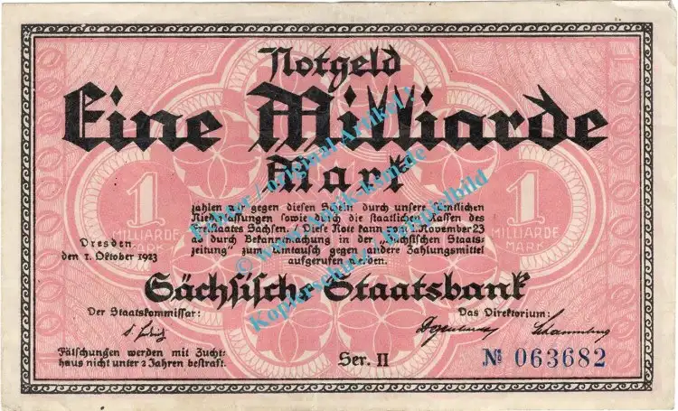 Gutschein / Banknote über Eine Milliarde Mark , Sächsiche Staatsbank Dresden , Großnotgeld 1923 InflationBundesland : Sachsen  ,  Keller : 1109.c