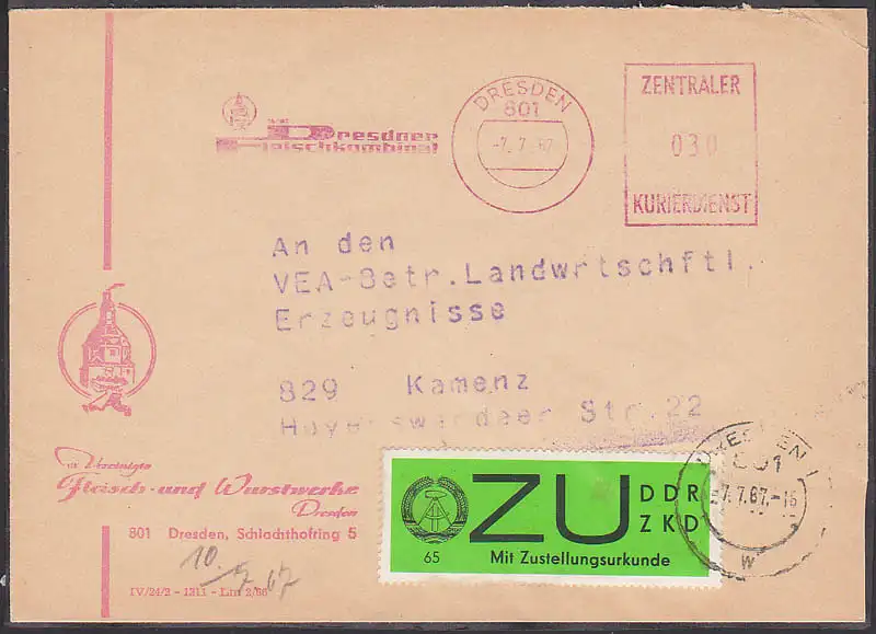 Dresdner Fleischkombinat ZKD-AFS mit ZU-Marke( E2y), 7.7.67