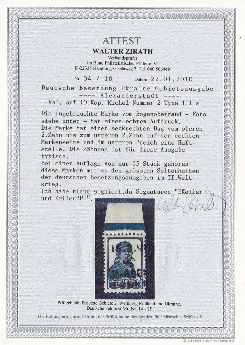 Dt. Bes. Ukraine-Alexanderstadt: MiNr. 2 IIIx, BPP Attest, nur 15 Stück bekannt