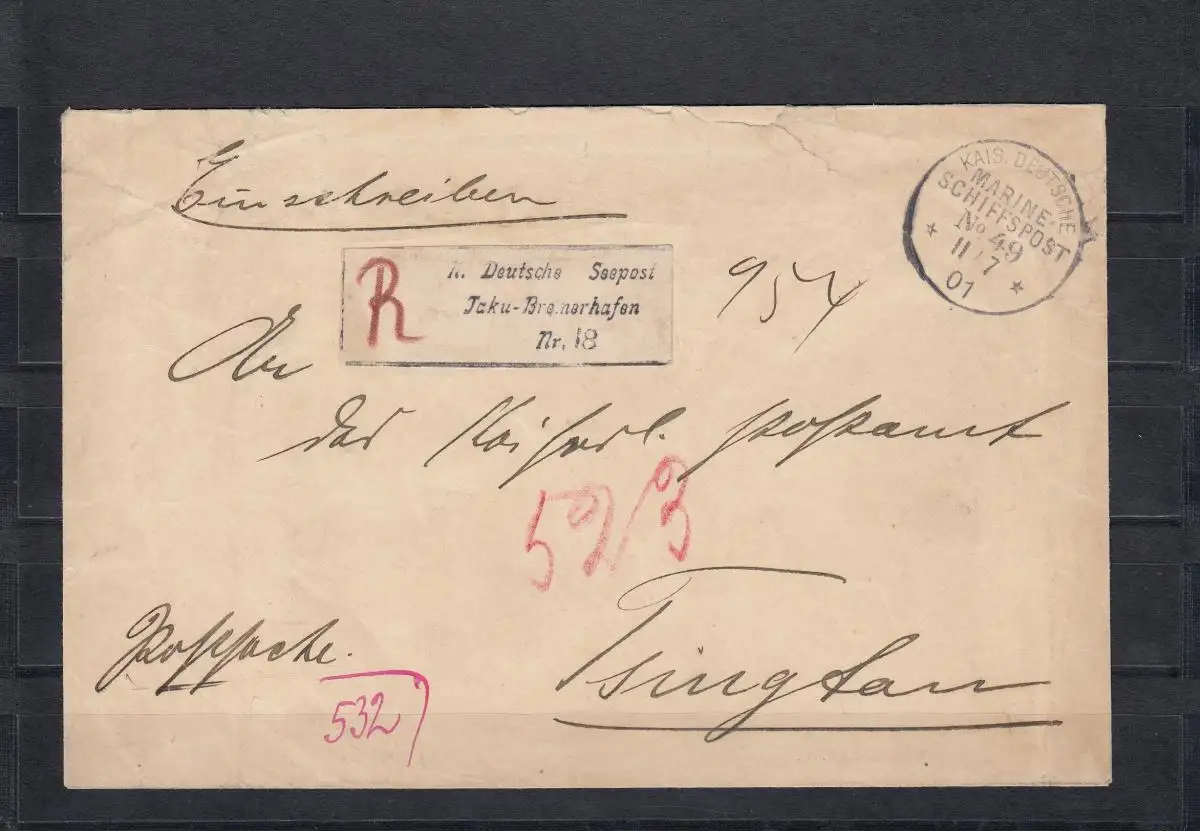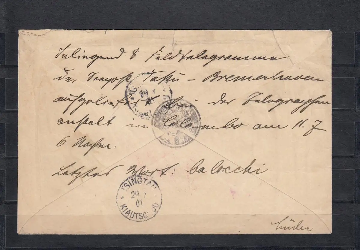 German Offices 1901, "Inliegend 8 Feldtelegramme" (8 field post telegrams included) on reverse of registered postal matter with provisional label "Deutsche Seepost Taku-Bremerhafen Nr. 18" (German sea posts Taku-Bremerhafen) from Colombo, telegraph station to imperial post office in Tsingtao with arraval date stampl on reverse vrom 29.7.1901 and official seal of steamer Palatia on reverse.