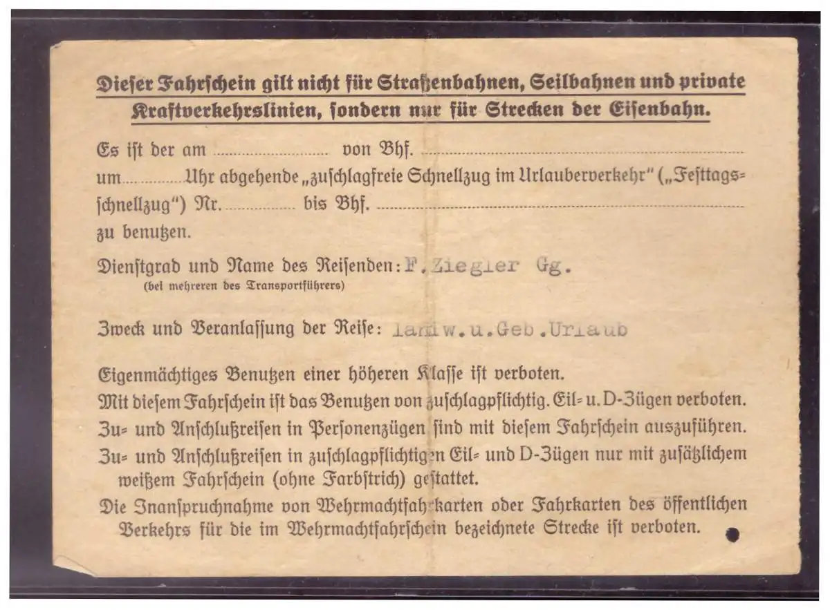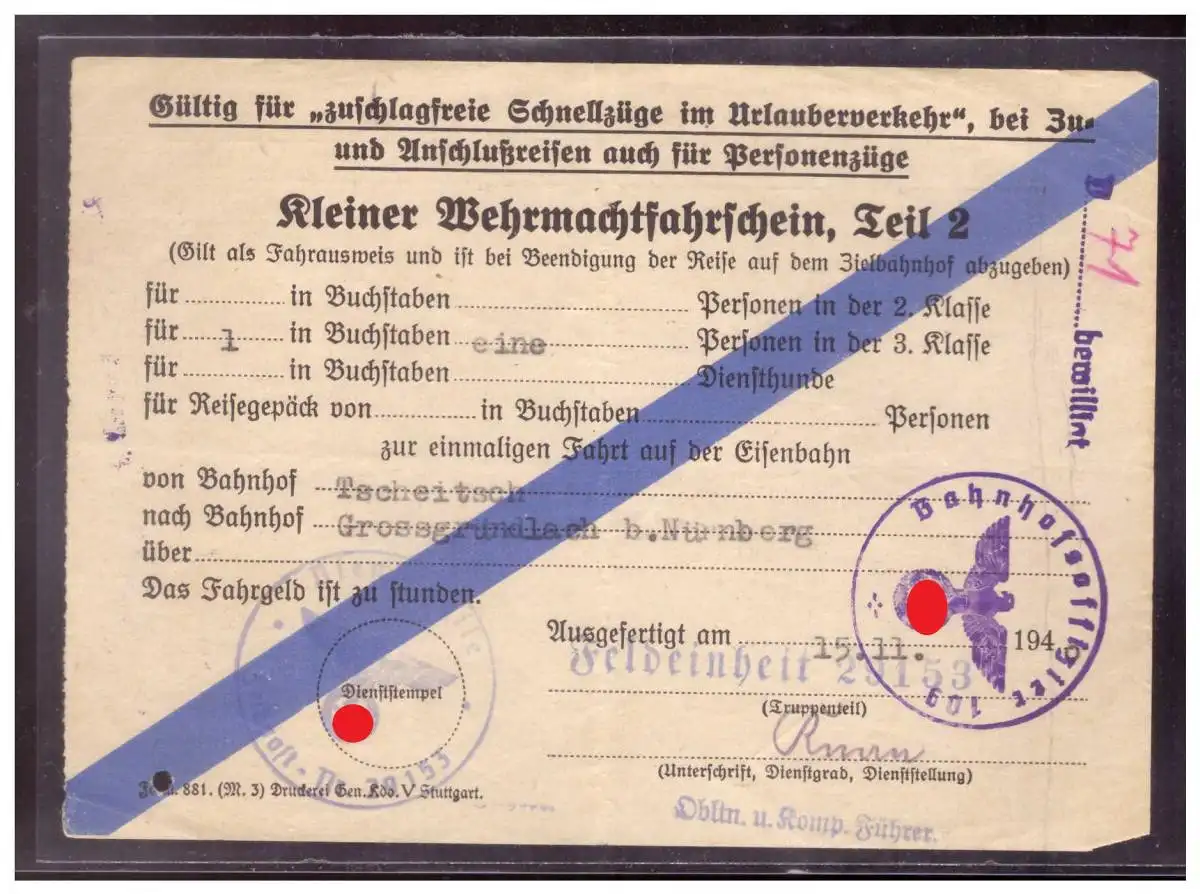 Dt- Reich (020281) Kleiner Wehrmachtsfahrschein Teil 2 von Tscheitsch nach Grossgrundlach b. Nürnberg am 15.11.??