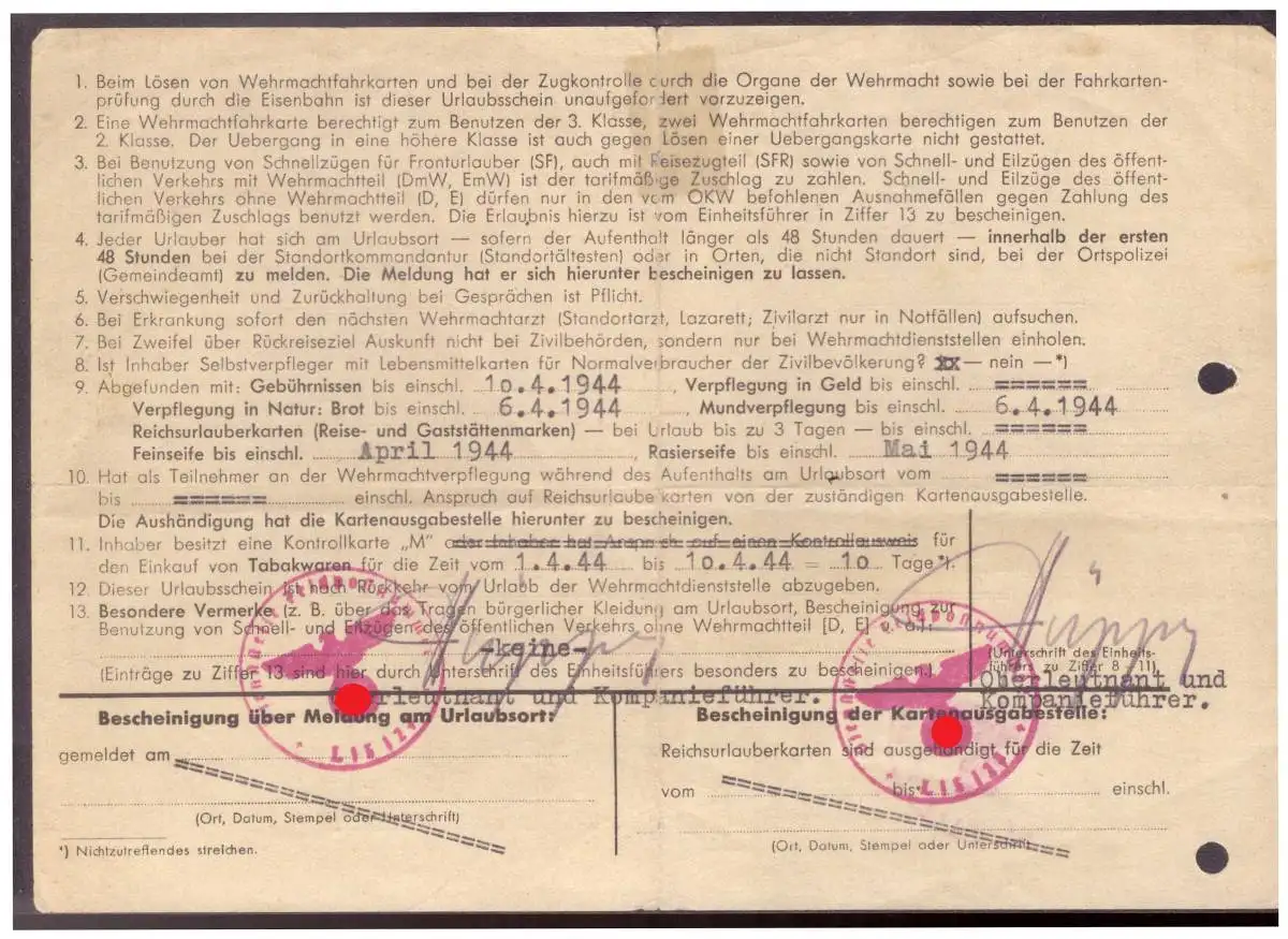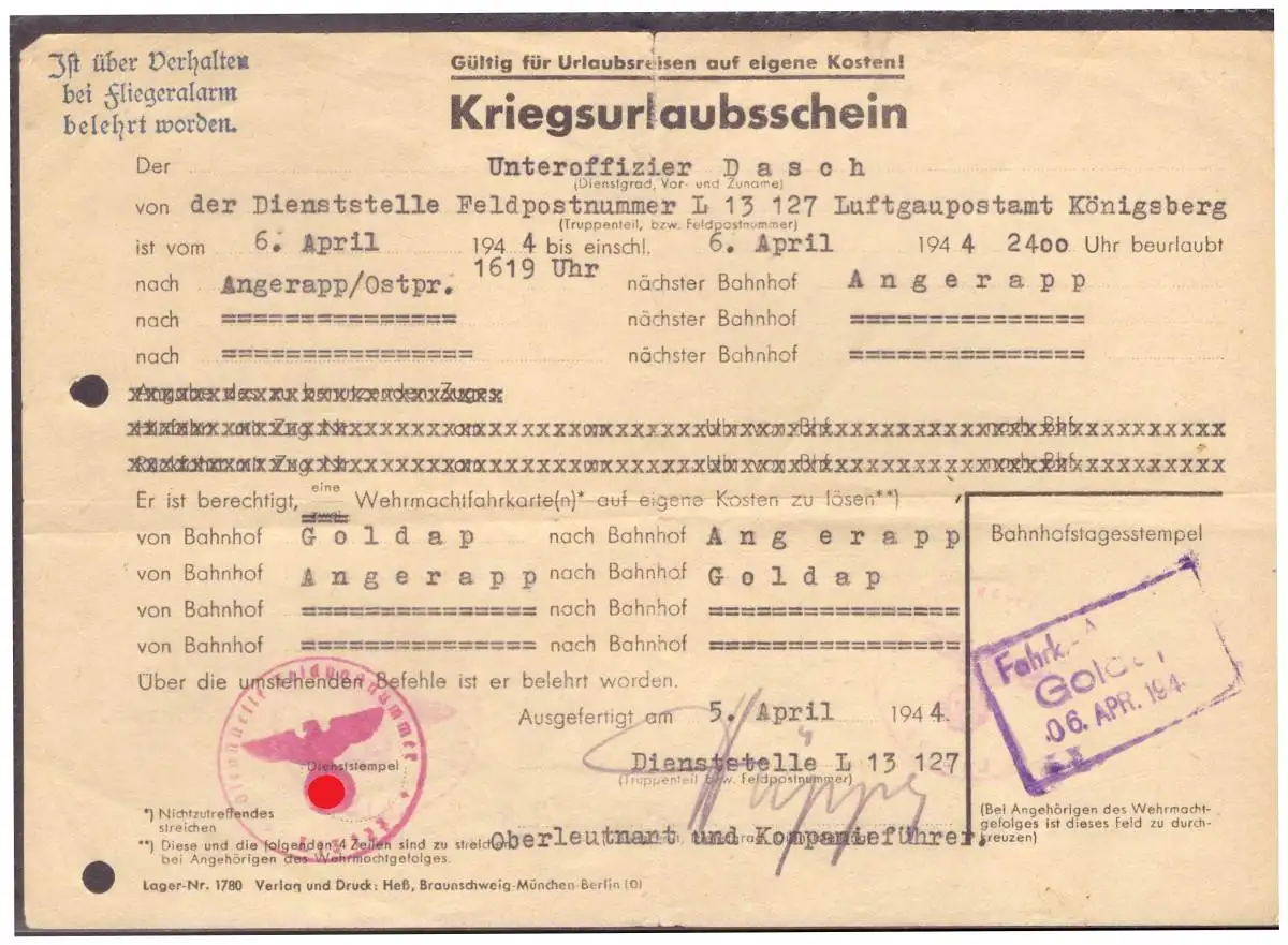 Dt- Reich (020308) Kriegsurlaubschein FPNR L13127 Luftgauamt Königsberg vom 5.4.1944