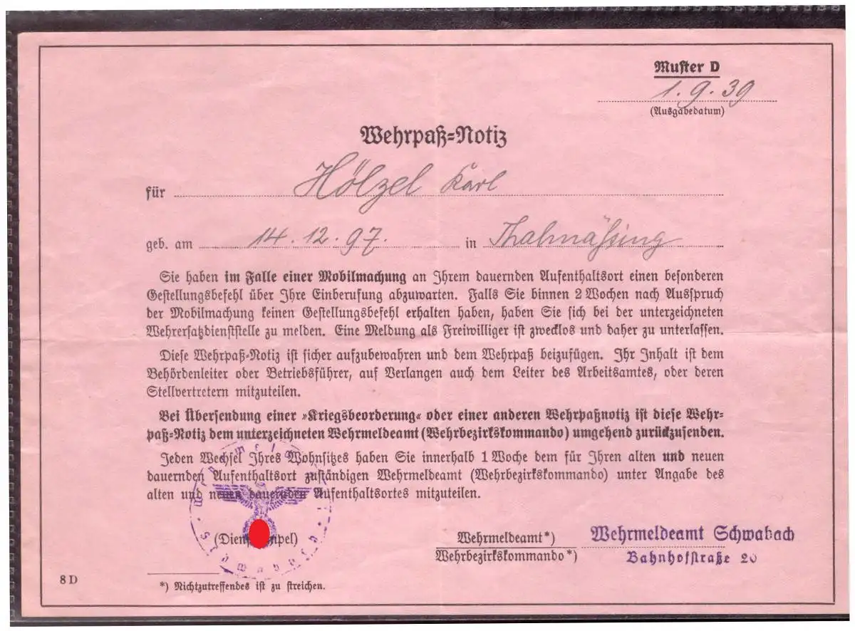 Dt- Reich (020320) Wehrpass= Notiz von Wehrmeldeamt Schwabach vom 1.9.1939!! Beginn des II Weltkriegs