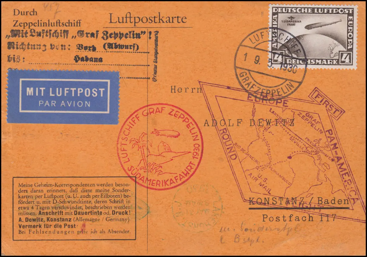 Zeppelin-Post Zeppelin-Karte 4 RM Südamerikafahrt Einzelfrankatur befördert mit dem Luftschiff Graf Zeppelin LZ127, Panamerika-Rundflug - dekoratives, authentisches Stück!