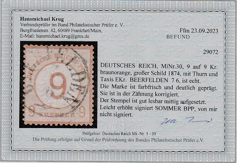 Dt. Reich Nr. 30, gest. Beerfelden, Befund Krug BPP