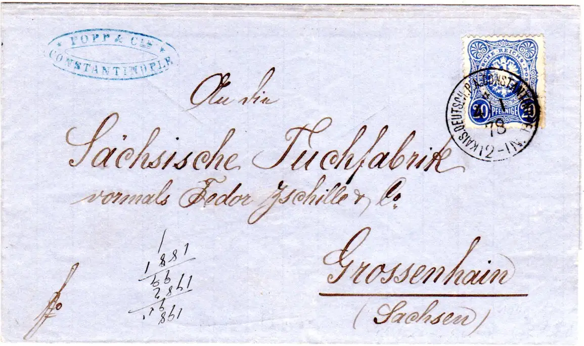 20 Pfge. auf Firmenbrief v. Constantinopel n. Grossenhain, Sachsen. Stempel KAIS.DEUTSCH.P.A.CONSTANTINOPEL m. Stern.