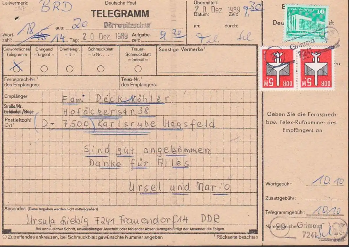 Dürrweitzschen (20) PSSt. Grimma auf Telegramm 20.12.89 nach der BRD mit 5,- Luftpost 2967(2)