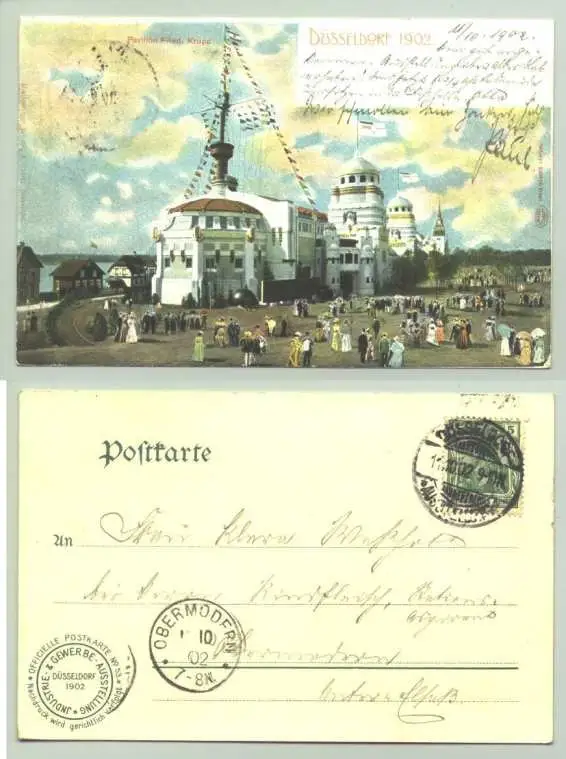 Artikelbeschreibung u. Zustand : Siehe Scan. Weitere Infos : Ansichtskarte. "Duesseldorf 1902" Industrie- u. Gewerbe-Ausstellung. Officielle Postkarte No.53. Mehrfarb. Ansichtskarte mit herrl. Abb 'Pavillon Fried. Krupp' u. zahlr. Besucher auf Freigelaende. Beschrieben u. postal. mit Marke u. Stempel v. 1902. PLZ-Bereich pauschal 40210
